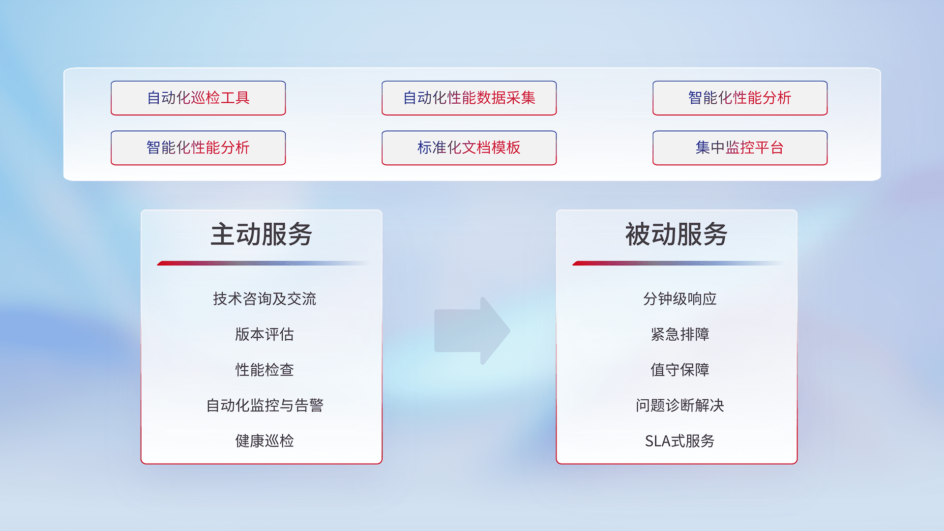 智能化工具和标准化文档,,,,保障服务质量,,,提供主动服务(包含技术咨询、、、版本评估、、、、性能检查、、、、自动化监控与告警、、、、健康巡检)和被动服务包含(分钟级响应、、、、紧急排障、、值守保障、、、、问题诊断解决、、、、SLA服务)。。。。
